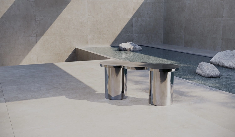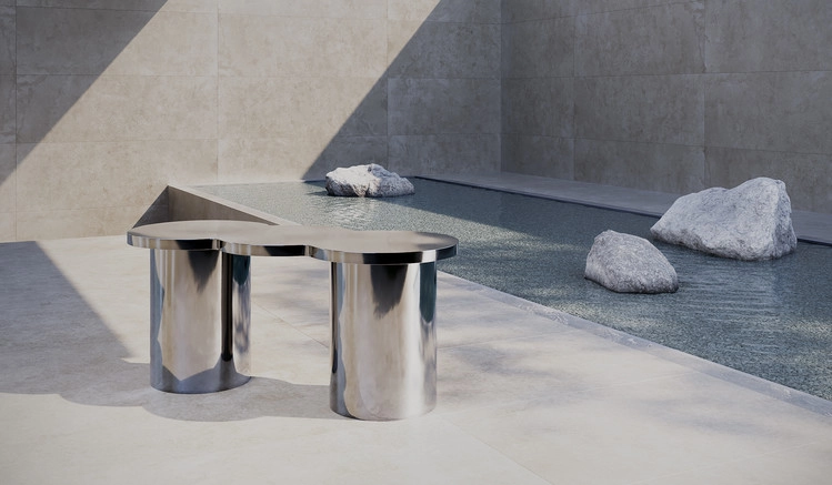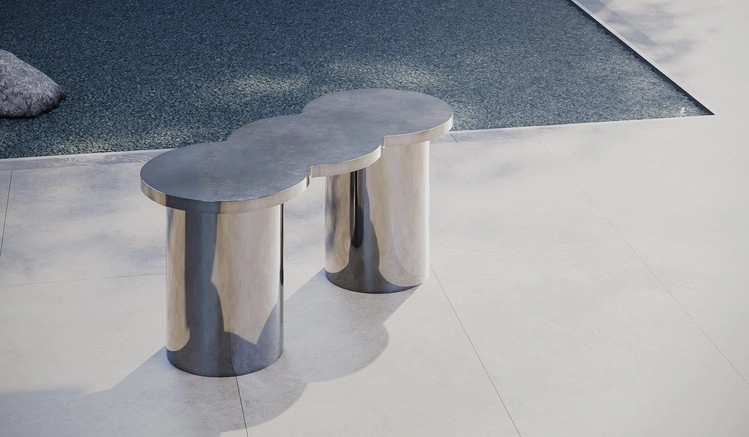 The cloud-shaped cloud table, with smooth, hard-to-speak curves in stainless steel, features magnificent size and flexible curves..