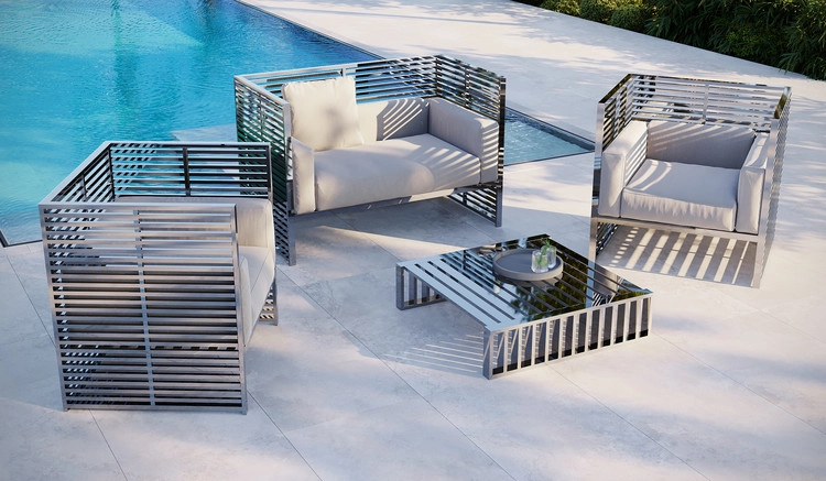 ‘Steel d Belluca’ outdoor furniture expresses a passion for the outdoors, harmony of light and shadow, and transparency of the sky and sea.