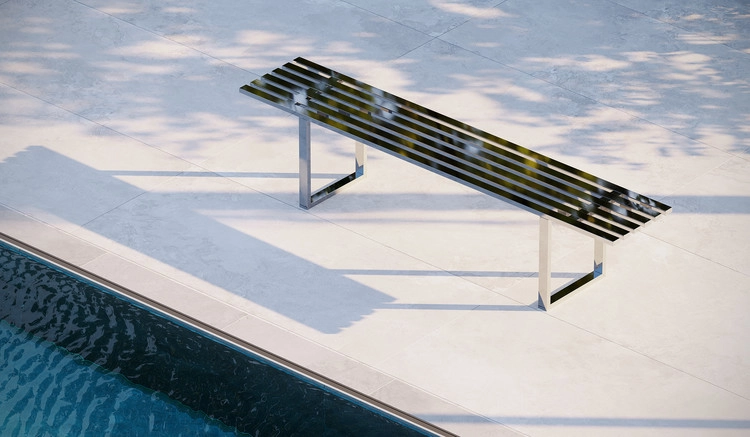 아이코닉 벤치는 실외 또는 실내에서도 다양하게 사용되며 여러개의 밀러 스테인레스 스틸 프레임은 세련되고 현대적인 느낌을 더해줍니다.